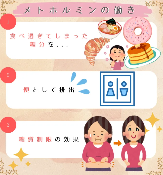 メ卜ホルミンは食べ過ぎてしまった余分な糖分を便と一緒に出す作用があります。