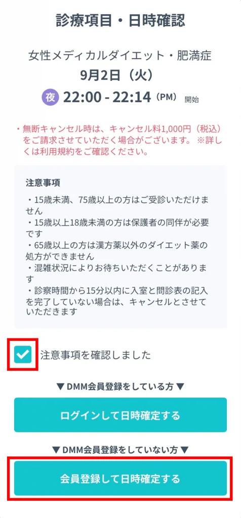 「会員登録して日時確定する」をタップし、会員登録&予約の確定をする。